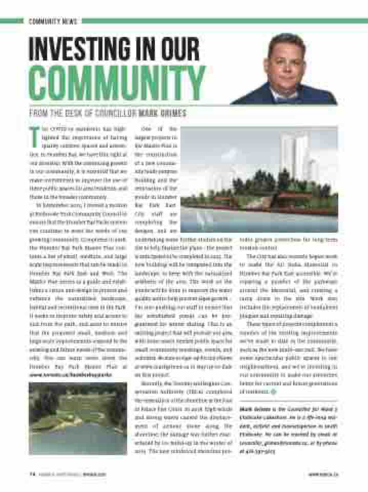 TheCOVID-19pandemichashigh- lighted the importance of having quality outdoor spaces and ameni- ties.InHumberBay,wehavethisrightat our doorstep. With the continuing growth in our community, it is essential that we make investments to improve the use of these public spaces for area residents, and those in the broader community.