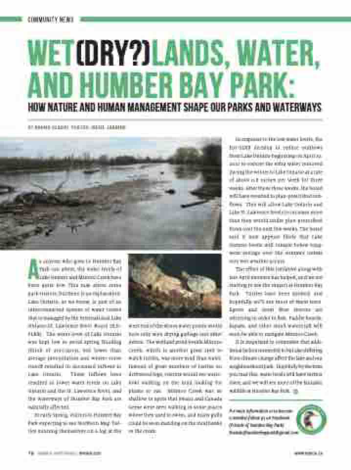 It is important to remember that addi- tional factors connected to but also differing from climate change affect the lake and our neighbourhood park. Hopefully by the time you read this, water levels will have further risen, and we will see more of the fantastic wildlife at Humber Bay Park. HH