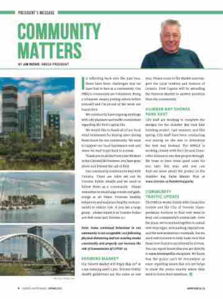 The HBSCA works closely with Councillor Grimes and the City of Toronto Trans- portation Services to find new ways to keep our community’s streets safe. Over the years, we’ve worked together to install new stop signs, new parking regulations, and the new pedestrian crosswalk, but we need enforcement to help make sure that these new features are obeyed by drivers. You can report issues that you see directly to www.torontopolice.on.ca/core. We know that the police can’t be everywhere at once; reporting issues that you see helps to show the police exactly where they need to focus their attention. HH